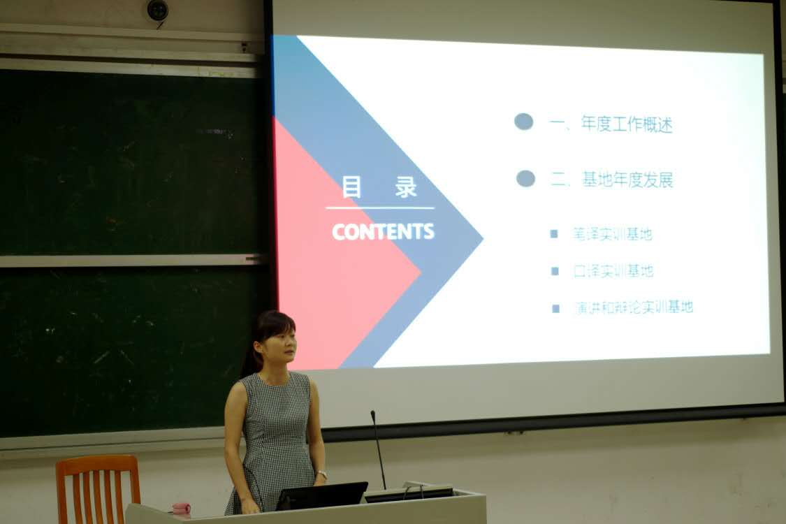 秘书部部长钟瑞桃对笔译实训基地进行了总结。她首先汇报了笔译队过去一年实践训练中取得的成果,重点展示了笔译队的实践活动,包括和南方电网、CSOFT-Alibaba、广州日报、智课网以及广二院合作的新长期项目以及实习培训活动。最后她提出了未来一年的期望,希望在完善落实各项制度、改革运营模式、建设语料库以及加强基地宣传方面能够做得更好。