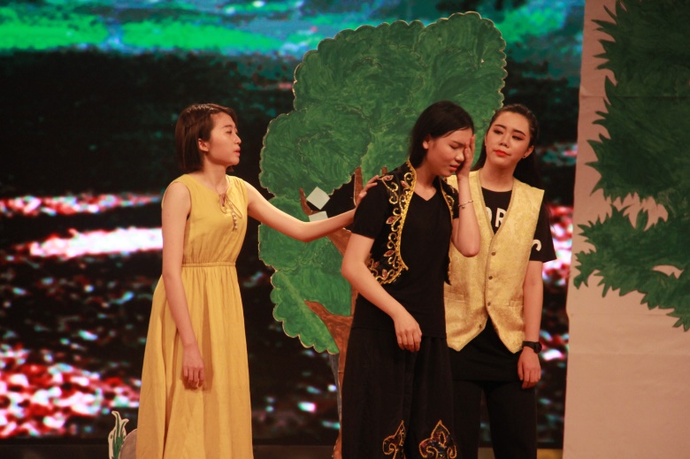 1502班的同学带来了《仲夏夜之梦》,讲述了由“魔汁”引起的冲突及冲突被解决,有情人终成眷属的故事。他们用富有感情的表演,折射着莎翁人与人平等相处、人与自然和谐共处的人文主义理想。
