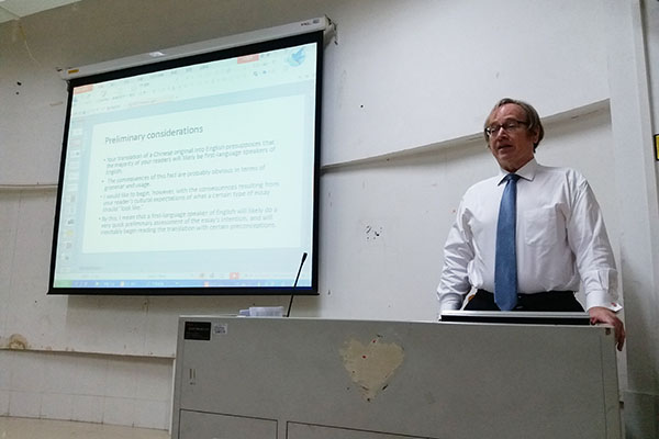 然后,Robert Tindol博士对汉译英组进行点评。与往年相同的是,他讲述了美国新闻界的变迁,再次强调英文作品的题目和首段的重要性。他对比选手的译文作品,细致分析其优劣。作为美国人,他分析benighted蕴含的贬义色彩,认为ignorant更能对应汉语中“蒙昧”含义,开拓观众的视野,让参赛选手学会从英美人的视角看待译文。