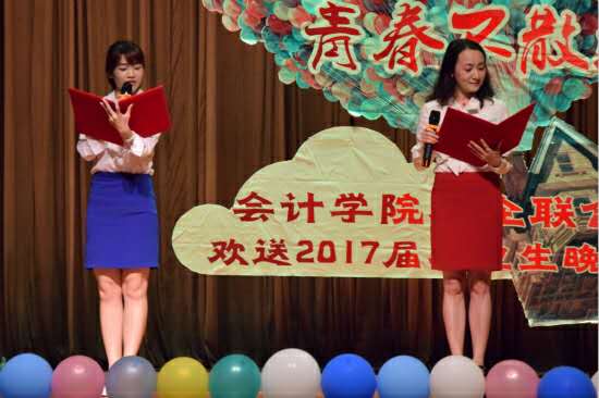本网讯2017年5月22日星期一晚7点,会计学院校企联合欢送2017届毕业生晚会在南校学生活动中心隆重举行。出席晚会的嘉宾有:广东正中珠江会计师事务所党办主任、总支委员解胜美女士;党办副主任、总支委员黄玉明先生;人力资源部经理、第一支部书记王纯女士、会计学院院长刘中华老师、党委书记孙家和老师、副院长汤胜老师、左志刚老师、党委副书记黄晓梅老师、审计系系主任黄浩老师、新闻传播学院团委书记陈博菲老师、会计学院团委书记邓海清老师、13级辅导员周雅颂老师、黄星老师、14级辅导员沈长霞老师以及16级辅导员丁建新老师。