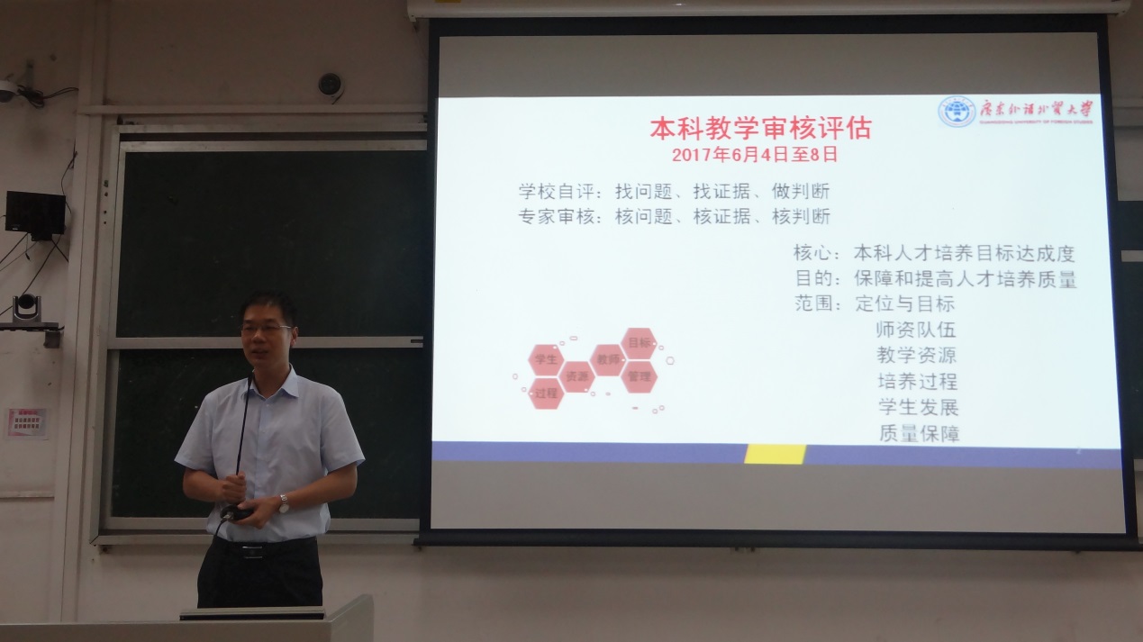 邢杰还介绍了学院的基本情况以及学院迎接本科教学评估所做的准备工作。他介绍了学院的办学定位、培养目标、办学特色、资源保障、培养过程和学生发展等方面,让在座的同学再次深入了解了学院的概况。并进一步指出本科教学审核评估对学院以及学生日后职业发展的重要性,并希望同学们能够以主人翁的精神积极参与本科教学评估,展示出高翻学子的风采。