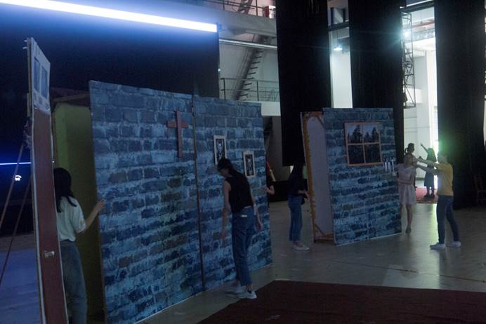 正午时分,四个剧组及英文团学的工作人员早早到达云山会堂,时刻准备第三次彩排。每一个人都谨守岗位,为道具定位、舞台布置、灯光调试、音效处理等不断忙碌着。虽然会场异常闷热,但是大家都高度集中注意力,力求尽善尽美。