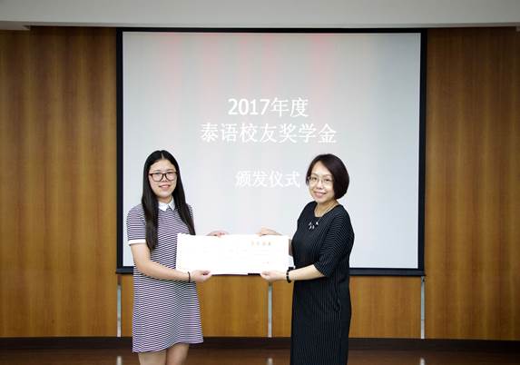 本网讯为了激励泰语系学生为本系做出积极贡献,泰语系特设立“泰语校友奖学金”,自2017年起正式实施,奖励泰语系优秀毕业生。6月8日下午,泰语系在MBA讲堂隆重举行颁奖仪式,东语学院副院长罗奕原老师为获奖学生颁发了荣誉证书和奖学金。泰语系全体师生参与见证了这一重要时刻。