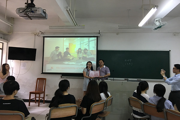 最后的提问环节中,三位主讲嘉宾耐心解惑,并表示将与院方合作,邀请广大英文学子到PWC参观,让大家更为深入地了解会计公司的行业现状与发展规划。而何伟儒则代表学院为朱慜颁发荣誉证书。他提议,同学们与优秀校友多交流、多了解社会、了解企业用人要求,不断完善自己的职业发展规划。