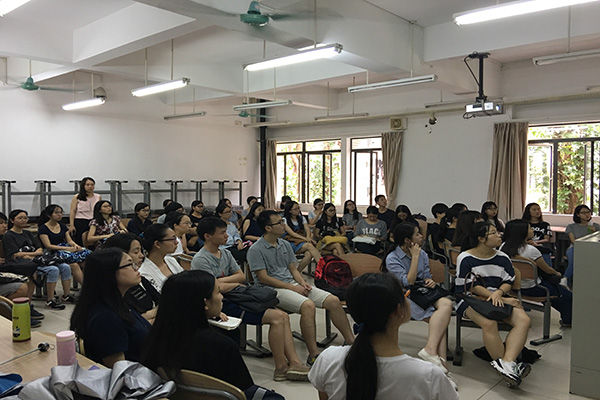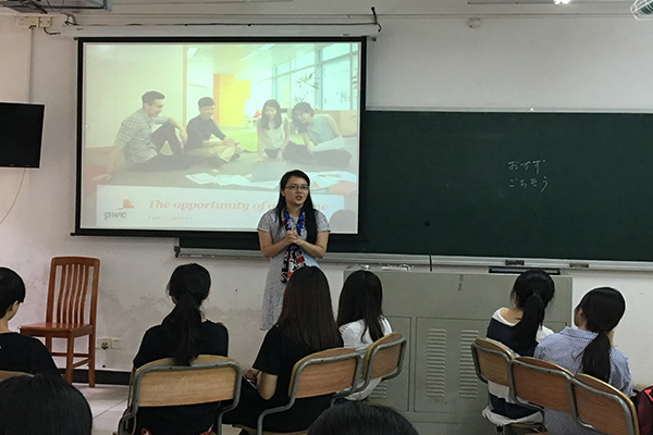本网讯6月15日下午2:30,英文学院举办的优秀校友交流会--普华永道职业生涯发展经验分享会在六教B204室举行,普华永道国际会计事务所(PWC)人力资源部高级经理、我院杰出校友朱慜(MindyZhu)及其工作伙伴EmilyRen、SantinoXiao担任主讲嘉宾。英文学院党委副书记何伟儒、2015级辅导员贾春成及2015级同学参加了本次交流会。