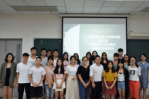 本网讯6月15日晚上21时30分广东外语外贸大学商学院第五届管理文化节闭幕式暨模交颁奖典礼在教学楼F栋108正式举行,出席本次管理文化节闭幕式的嘉宾有商学院团委书记杨欣及商学院团委学生会主席池晓霓。