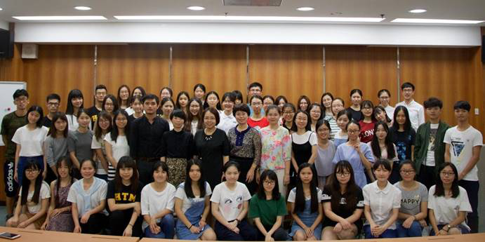 本网讯 2017年6月8日下午,我院泰语系师生在第九教学楼(MBA教学楼)403课室举办了一场精彩纷呈的泰国影视剧配音大赛。泰语系全体老师以及泰语系大一至大三三个年级的学生都参加了这场比赛。三个年级的同学随机打乱分组,总共分为九组,每组都有一至三年级的学生。