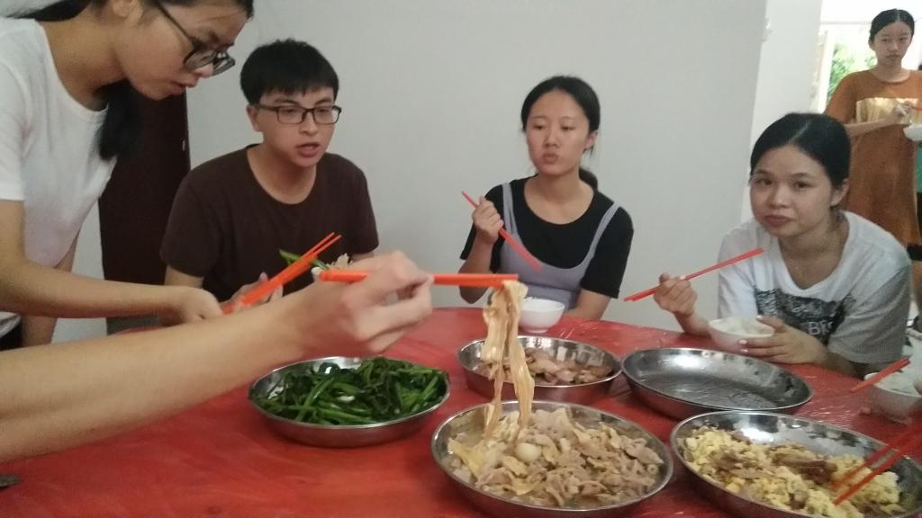 本网讯2017年7月7日是我院三下乡服务队“乡伴经夏”支教活动正式开展的第一天。强大的队伍背后一定会有一支强大的后勤力量支撑,结束了一天忙碌而具有挑战的见面会、义教等活动后,后勤组为大家准备了丰盛的晚餐作为补给。白坭中心小学的饭堂阿姨为我们此次三下乡之行准备了充足的柴米油盐和炊具,以桶为单位的洗洁精、酱油等让同学们也惊讶于基地学校的热心。后勤组的两位男生在学校提供的宿舍厨房里大展拳脚,为大家准备了叉烧炒蛋、蒸肉饼、炒时蔬、腐竹炒肉等菜品,大家都赞不绝口,表示没想到下乡之行还能有如此丰盛的伙食。除此之外,后勤组还煮了一大锅汤。“乡伴经夏”的队员们其乐融融地一起吃饭,场景好不温馨。