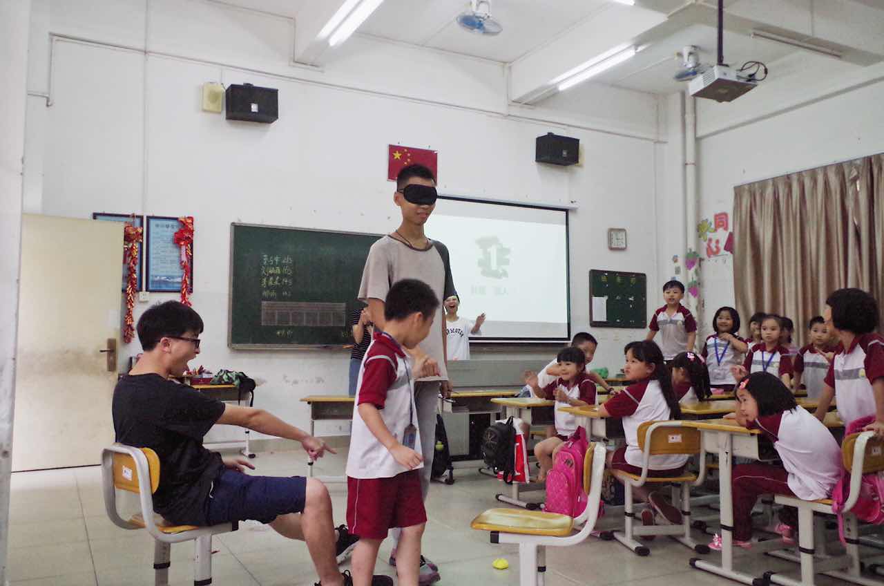 7月8日上午,因为是学校的散学典礼,所以没有课程。义教组全体人员各自做着下午授课的准备。在下午第一堂的处事小技巧课堂上,老师先组织了一场游戏。同学们非常热情,即使外面下着雨,有点凉意,我们也被同学们地热情所感染。他们都争着先玩,在马老师的有力组织下,我们的几位助教老师弄了几个障碍物,每次随机抽两名学生。一个当“哑巴”一个当“瞎子”,游戏规则是让“哑巴”带领“瞎子”走过障碍物,“哑巴”不能出声,“瞎子”戴上眼罩,两人不能越界和不能碰到障碍物。每个同学都参与,第一轮结束后,“瞎子”、“哑巴”互换角色。通过这堂课,学生们领会到了面对困难要团结,要学会与他人沟通。