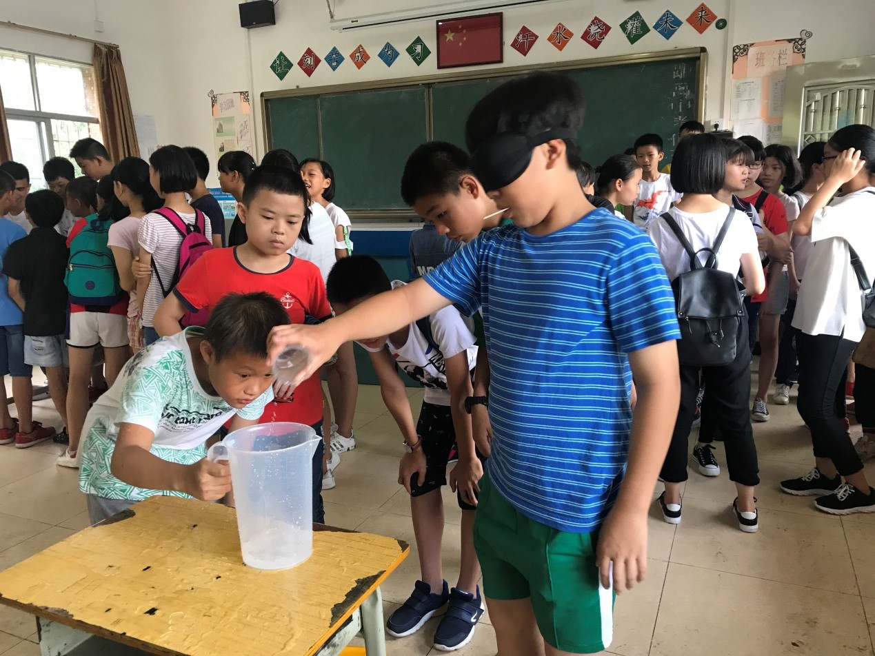 参与者需两两组队,在规定时间内一人蒙住双眼听另一人指挥往杯子中倒水,水面与所标刻度相平即可过关。