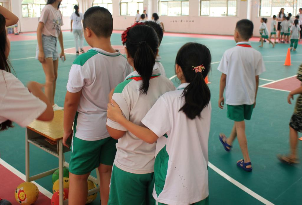 举行趣味运动会之前,班主任们把每个班分成两列并且带领他们做准备活动。怀着对趣味运动会的期待,学生们有序完成准备运动。