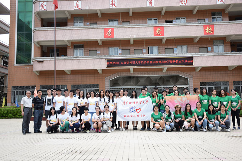 十一点多时,汽车驶入曲江二中,校门口的“欢迎广东外语外贸大学到我校开展暑假三下乡志愿活动”彻底将我们的热情点燃。与“心乡印”三下乡志愿服务队共同到来的还有“全英”三下乡志愿服务队。下车后,曲江二中的领导亲自接待了我们并与我们在教学楼前合影留念。