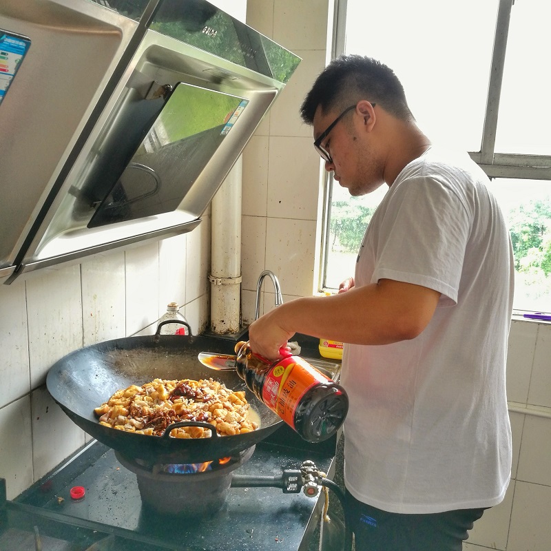 九点半,后勤的各位将士马不停蹄,为了丰富的午餐,牺牲休息时间,投入到做饭的光荣事业中。择菜,切肉,拌蛋,简单而量大,随便一样都不是三两分钟可以解决。伴随着持续机械性动作,将士们的额头泛出滴滴汗珠。也许他们在家里衣来伸手饭来张口,也许他们还未曾开过炉火做过饭菜,经过几天的尝试与磨练,后勤的各位成员在做饭方面熟能生巧,从容不迫。豆腐炒瘦肉,上演一场精彩的“左手右手一个慢动作”,一边翻炒食物,一边加油加盐,两手并用,发挥最大效益。十一点半,四十多人的午餐,虽不及五星级酒店的精美,也不及路边烧烤店的诱人,但它却是后勤各位历时两小时的劳动成果,荤菜素菜,白饭清汤,应有俱有。对于辛苦工作一早上的队员们来说,后勤的“大餐”是对他们最好的慰劳。