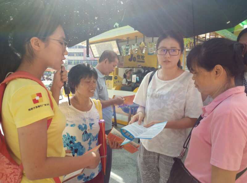 不多时,太阳高挂,烈日灼灼。到达目的地后,队员们并没有因为炎炎烈日和计划被打乱而慌乱退缩,依然有条不紊地进行街访准备工作。准备过程中,就有闻讯前来的学生和家长进行咨询,咨询的学生家长告诉我们遇到了无法登陆网址,不懂贫困认证等的问题,队员在讲解后同时也向其告知可前往吴川市教育局一楼进行更详细的咨询并进行办理。在我们详细解答后,他们也为不熟悉当地的我们介绍了同德城的一些基本情况。得到了他们对我们工作的认可,我们也开始了一上午活力满满的街访活动。
