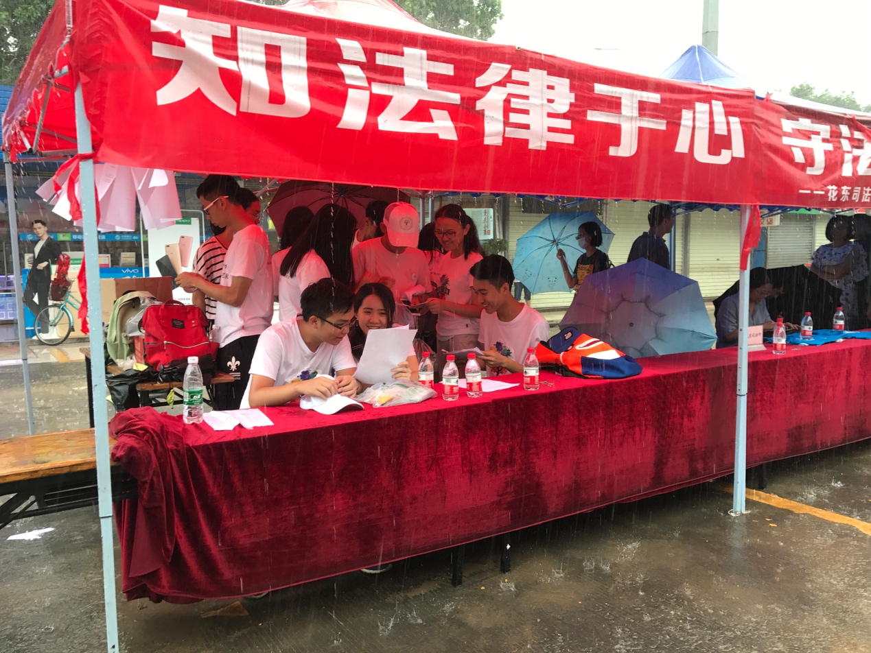 尽管普法活动在刚开始时,天气并不如人意,前期的准备工作刚完成时,倾盆大雨也随之而至,甚至影响了活动的继续进行,可是这样的意外并没能浇灭普法组队员们的热情。