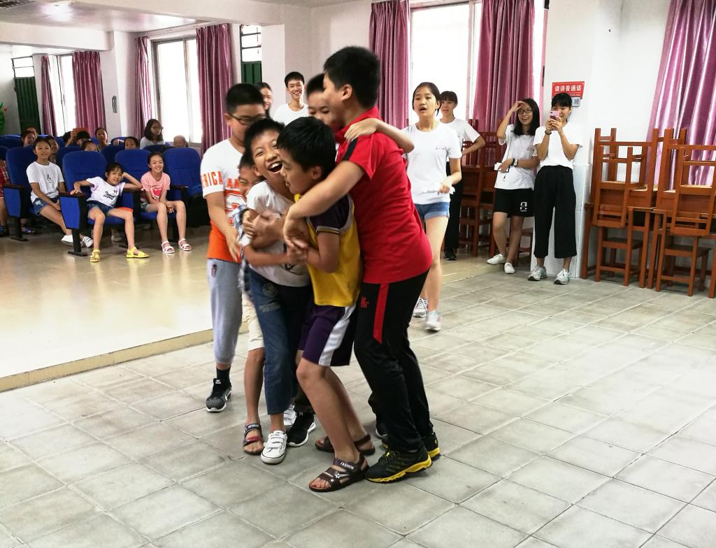 在互动环节,先由夏语予人服务队的陈晓慧队长与谢鸿凯副队长介绍队伍的基本情况并对下乡十天的生活做出美好的展望,之后便到了孩子们最喜欢的游戏环节。看着孩子们热情洋溢的笑脸与在空中拼命挥舞的小手,队员心中对冷场、被排斥的不安最终烟消云散……义教组中的两位班主任也表示:“看到同学们开朗的笑脸,听到同学们开怀的笑声,自己对工作也更有信心,更有激情。”
