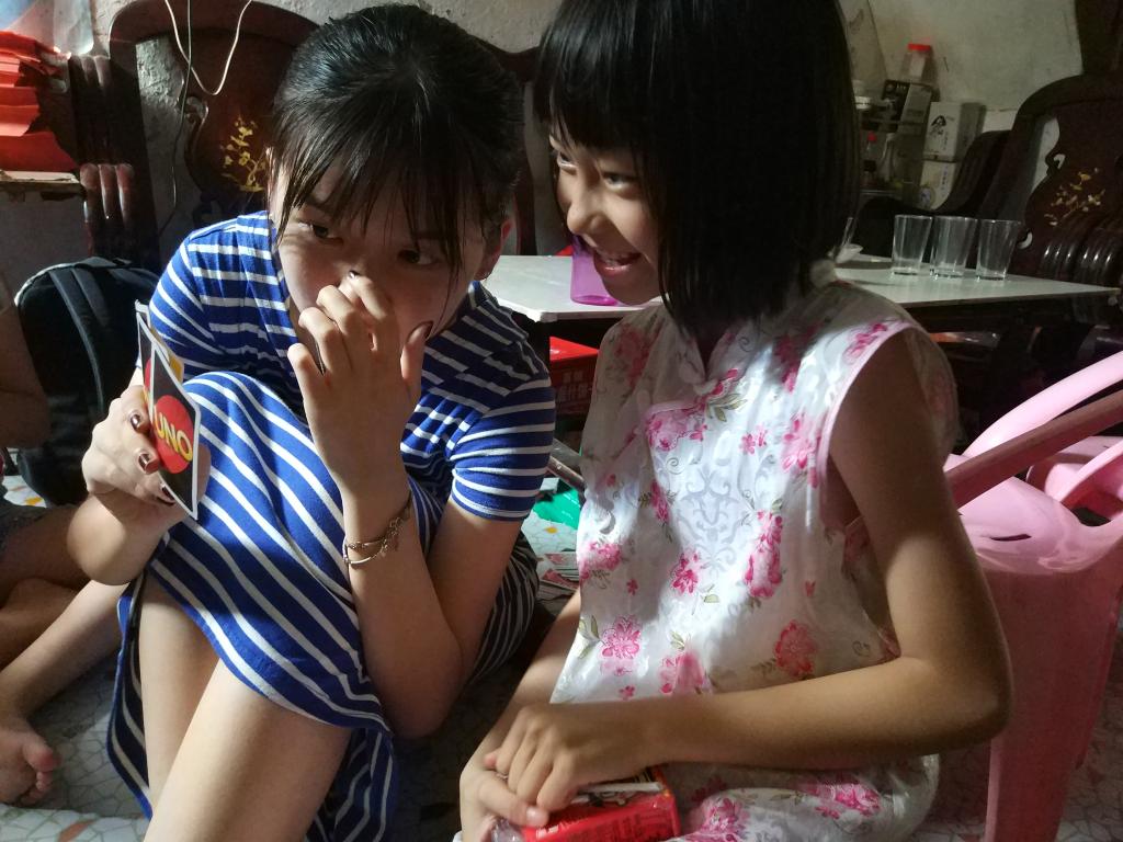 虽然才读四年级,苗苗小朋友却非常懂事。我们刚到家里,她就热情招呼我们进去乘凉休息,还贴心为我们烧水倒水。不一会儿,住在祯苗小朋友家附近的小伙伴也来做客,小朋友们热情邀请小老师们玩起了“UNO”桌游小游戏,小朋友们的聪明开朗活跃了气氛,让小小的房子里传出一阵阵郎朗的笑声。