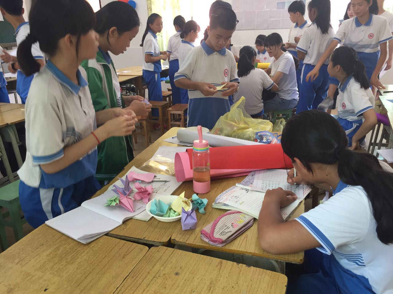 一下课,报名作为卖方的小组就开始一起制作手工作品,各色的彩纸和彩带在同学们的手中变换出了生动有趣的造型,体现出了他们的创造力和想象力。老师们也坐在同学们中间跟他们一起制作,给予他们必要的支持与鼓励。