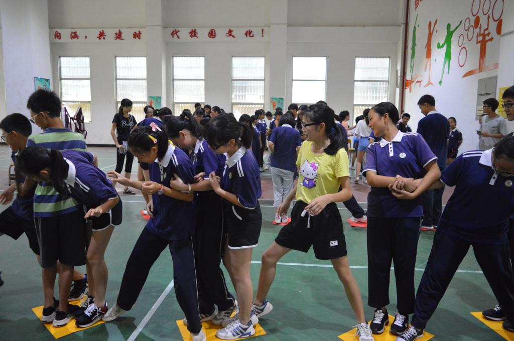 本网讯7月13日上午,广东外语外贸大学会计学院“S.D.R.”三下乡服务队在珠海市斗门区城东中学和学生们进行了一场别开生面的趣味运动会。虽然天气炎热,但学生们热情高涨,笑容洋溢,玩得十分尽兴。趣味运动会共有4个项目,跳大绳、运乒乓球、搭桥过河和勾肩搭背。趣行、知世两个班共分为六组进行比赛