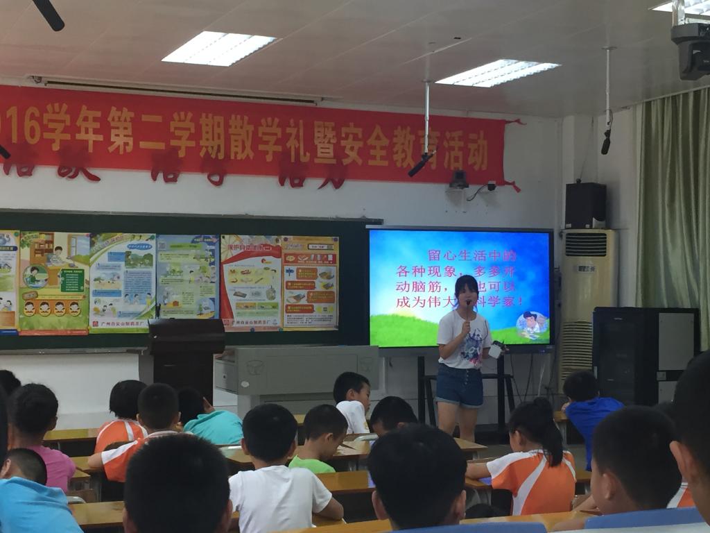 前期我校爱飞翔·薪火起航服务队志愿者进行了海报张贴及课程试讲等准备工作,在12点同学们进食午餐后,爱飞翔·方舟起航服务队的志愿者们带领着孩子有序地进入活动场地并就坐。12点30分,“科普你我他”进穗石小学科普活动正式开始。