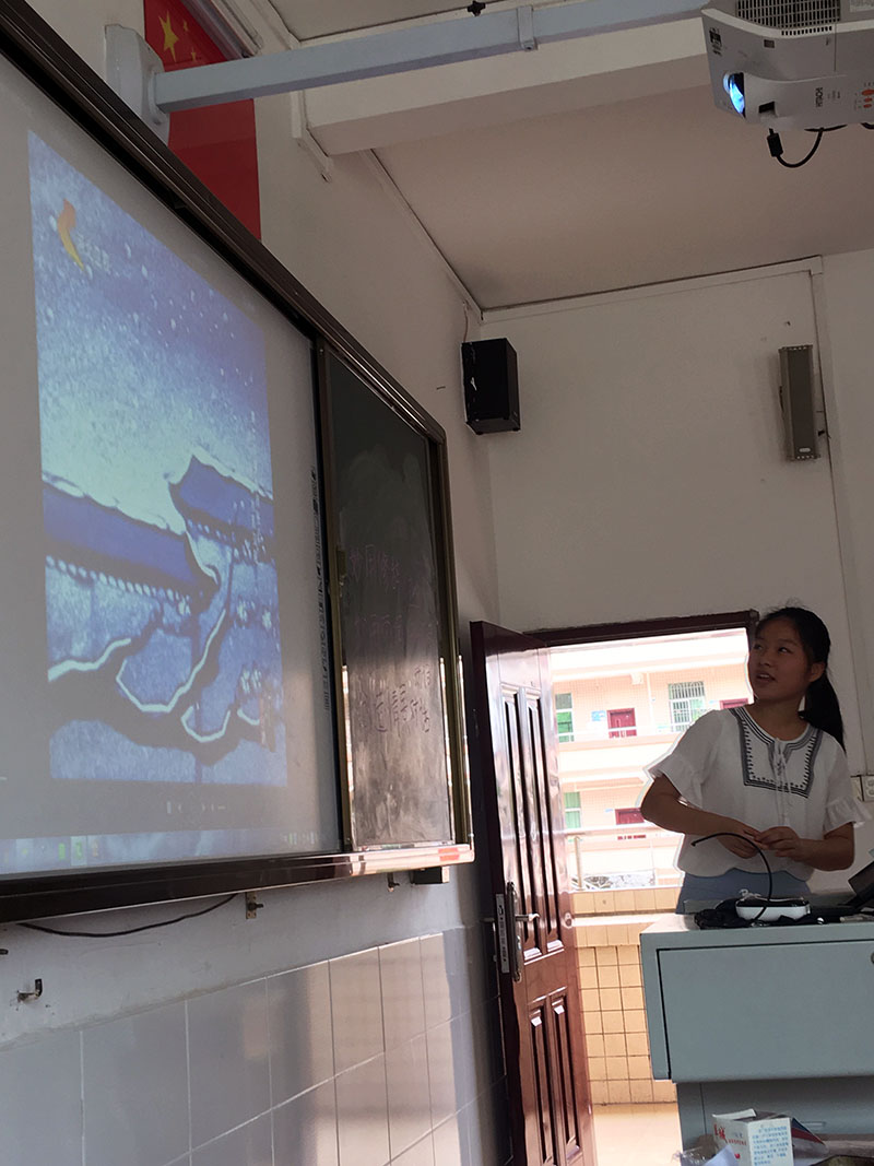 基于孩子们对于诗词知识的热爱,穗萍老师精心准备了PPT与视频教导学生如何在作文描写出美妙的意境。看完了第一段诗词沙画视频,孩子们纷纷提出许多问题,于是接着播放视频,穗萍老师开始用PPT向孩子们从简到繁介绍起诗词画面的修辞和意象,孩子们都展现出极大的好奇心与热情。他们相互讨论,争着发表各种观点。最后这节课以一首《池上》作为结尾:“小娃撑小艇,偷采白莲回。不解藏踪迹,浮萍一道开”,场面童趣动人。通过这节课,学生们能从中学习到诗词中的修辞和意象,以便以后在写作文时能够有所借鉴。