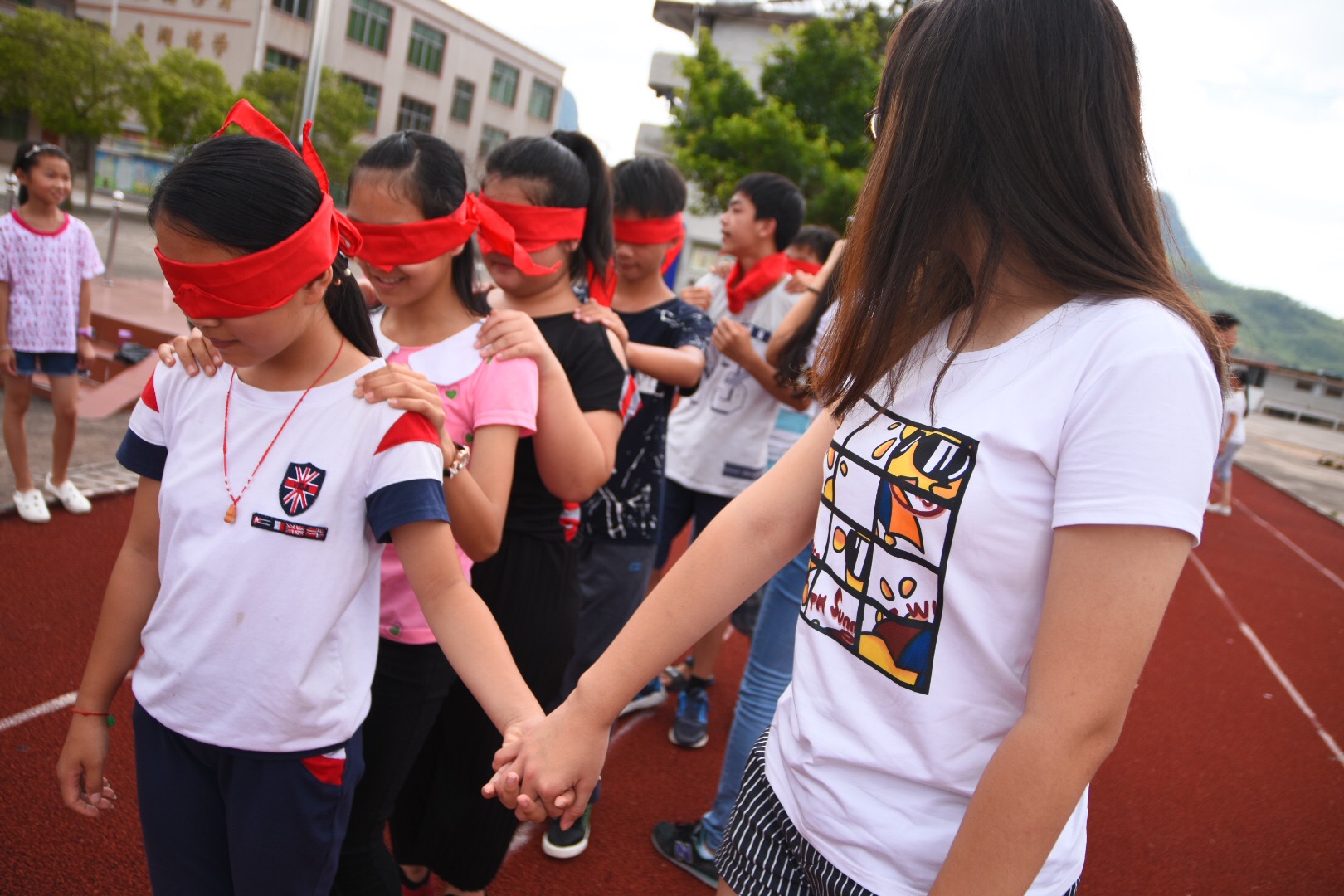 下午,是队员们筹备许久的新晴小运会。运动会将老师和同学们一起分成四组,大家需要一同参与,完成四项挑战,总计时间最少的队伍就将获胜。第一个项目是仙人指路,首先在地面上将雪糕桶摆成蛇形,每大组选出6人被蒙住双眼,被蒙住眼睛的6人从第二人开始将双手搭在前一人肩膀上排好队,另外4人负责指引道路通过障碍物,只能通过语言沟通,不能有肢体接触。前三队的成绩非常接近,但第四队在陈俊楷老师的带领下,配合默契,没有撞倒一个障碍物,快速通关拿下第一。只是天公不作美,在准备开始第二个比赛的时候,天上突然乌云密布,下起了小雨,为了避免小朋友们淋雨感冒,队员们很快地安排小朋友们回到课室。由于下了雨,无法再在户外进行游戏,队员们决定使用备用方案,把户外比赛改为室内进行。虽然游戏改在室内进行,但小朋友们的热情丝毫没有减少。