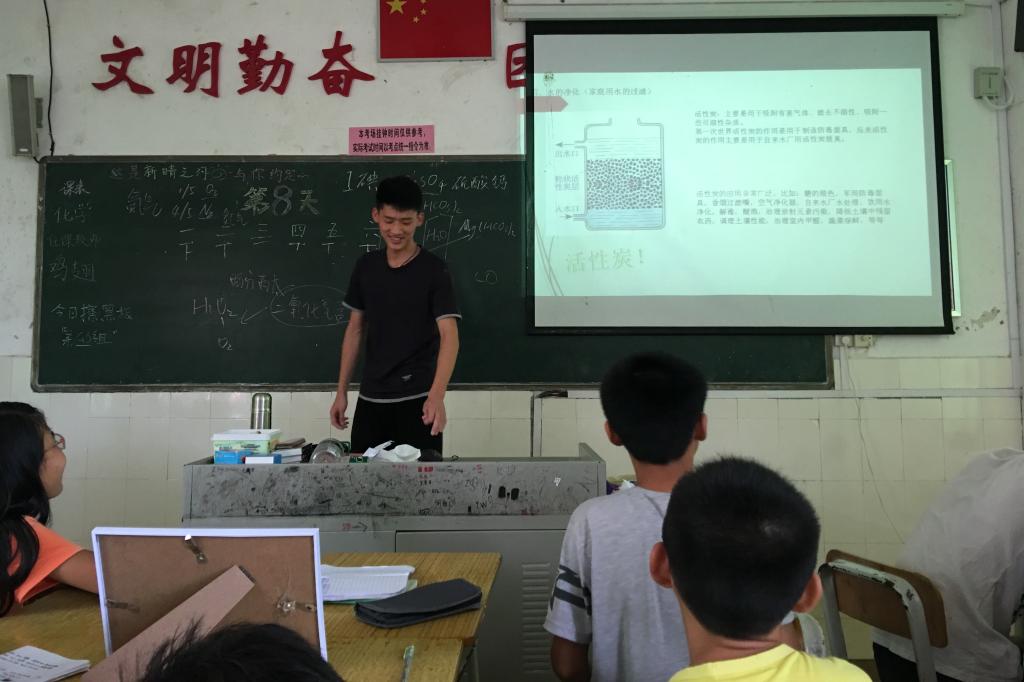 第二节由纪驰彬给大家上化学课,对于没有接触过化学的学生们来说,听懂概念和化学式是很难的。老师通过主要讲解生活中的化学案例,播放化学视频,让大家初步接触化学。第三节是一节语文课,麦雅老师给大家讲解古诗中的遣词造句——为什么不用“照”而用“撒”?大家沉浸在古诗优美的语言中。