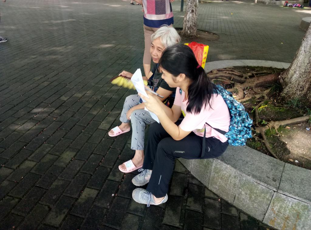 一大早七点半船员们就已在楼下集中,拍过大合照后四个小组分头行动前往目的地点。之所以要如此早出门,是因为我们其中一个调研对象阶层——老人的活动时间总是比较早,我们必须要迎合他们的活动时间来进行工作才能更有效率地完成调研。我所在的小组调研的第一站是逸仙湖公园,八时许到达公园,园内满是前来晨运的老人,从50岁的至到90岁的老人都有。事不宜迟,我们兵分两路,分别绕着湖的两边寻找老人进行访问。我们以坐在凉亭闲聊的老人为目标,拿出准备好的问卷开始与老人进行访谈。