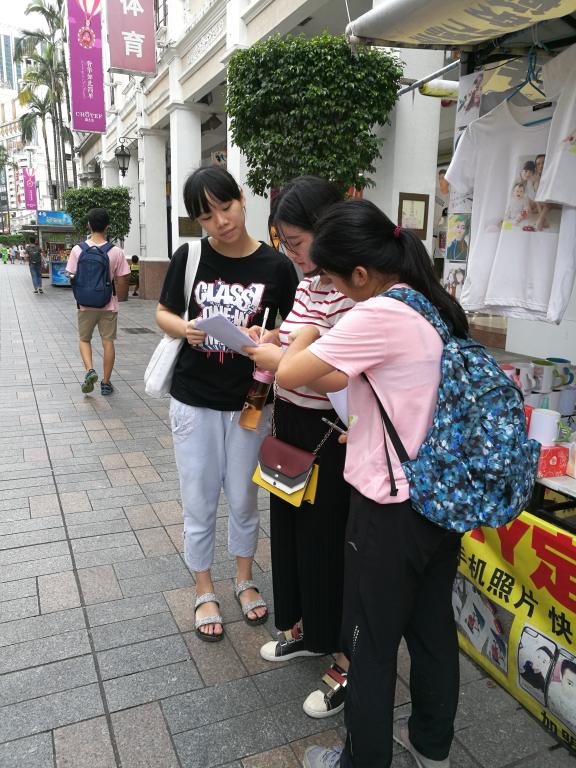 在公园调研了一个多小时,我们完成了老年人部分的问卷,接下来是青少年部分的问卷。为了找到更多受访人群,我们来到了文化旅行步行街。今天是周一工作日,上午时分步行街上的路人比较少,加以受到步行街保安人员的阻拦,青年部分问卷做起来比老年人困难一点。但我们还是十分主动积极地四处去找青少年接受访问。青少年部分问卷以直接把问卷给他们填写的方式进行,遇到他们有疑惑的问题我们再进行解释。中山市的青少年还是比较热情地,大多都接受了我们的调查,当中也不乏与我们同龄的大学生,他们都根据自己的实际情况、真实想法完成了我们的调查问卷。