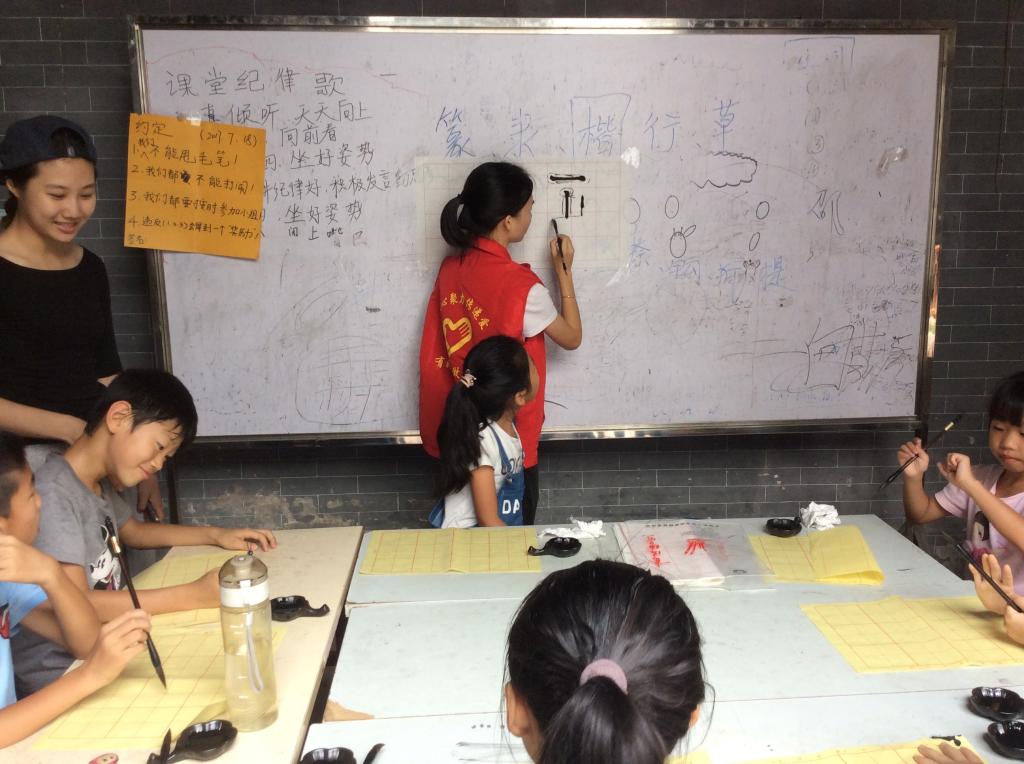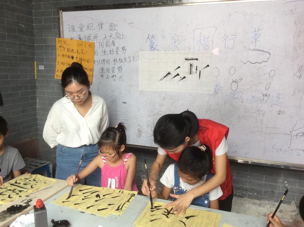 本网讯7月25日上午9点30分,我校爱飞翔·薪火起航服务队义教组书法小组准时来到贝岗村委会即邵氏宗祠,开始第二周的书法课程教学。令人欣喜的是,尽管距离上一次书法课程已有了一定的时间,但同学们对前两节课所学内容依旧掌握的比较牢固。