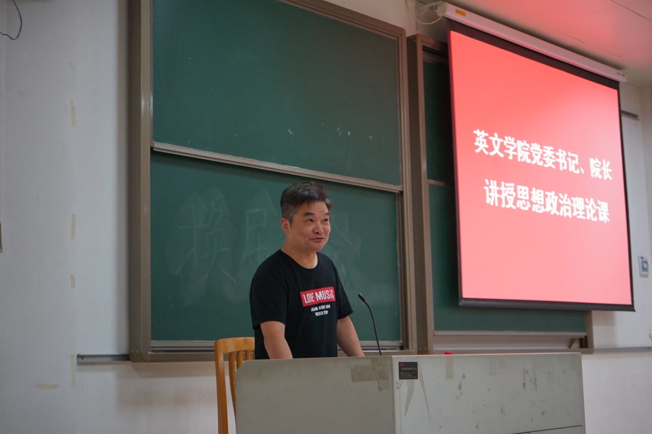 9月26日晚,英语语言文化学院党委书记王斌、院长温宾利在七教314讲授思想政治理论课。党委副书记何伟儒、14级辅导员王栋、16级辅导员兼团委书记王晞、17级辅导员马骁出席理论课。本次思想政治理论课讲座由15级辅导员贾春成主持。