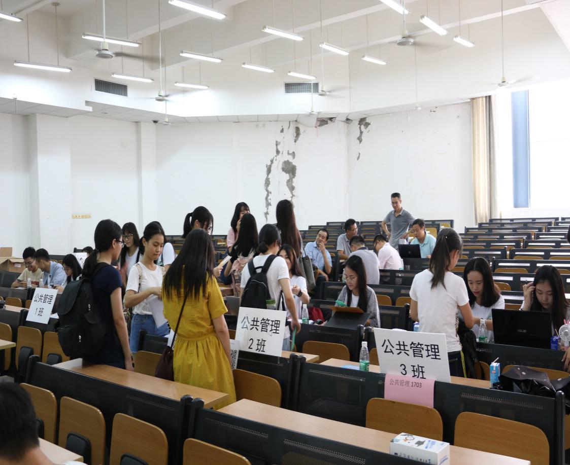 政管学院的院长彭未名、党委书记高云坚、副院长毛国民、党委副书记邵兵、团委书记(15、16级辅导员)白志华、公共事业管理系主任陈胜以及17级辅导员房瑞佳在注册现场负责制定迎新工作的宏观目标,他们不仅对新生们加以引导而且给予新生们支持与鼓励。在学院领导的支持与带领下,政管学院的迎新工作目标明确,各迎新工作人员得以高效完成各项工作。
