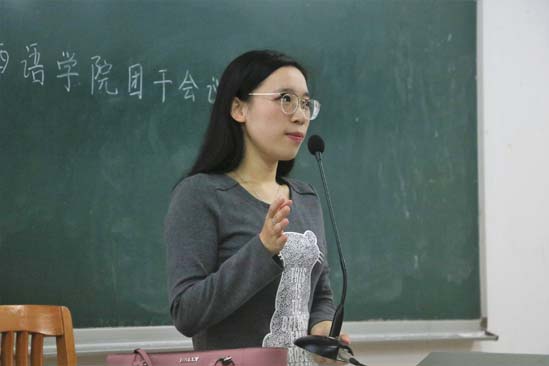 会议开始,辅导员张悦欢老师对各班已完成的团日活动进行总结与点评,并以俄语1701班、俄语1702班的团日活动为范例,强调大学生活中班团干部积极负责,互相配合的重要性。