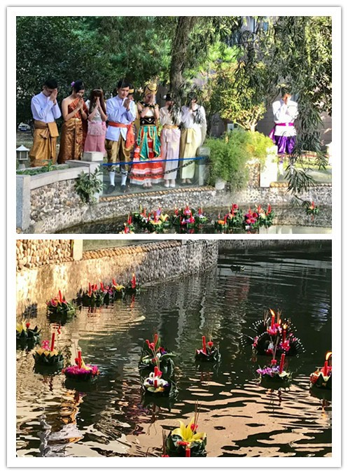 讲座结束后,开始了泰语系传统的水灯节活动—放水灯,大家一起移步到池边漂水灯并祈福。