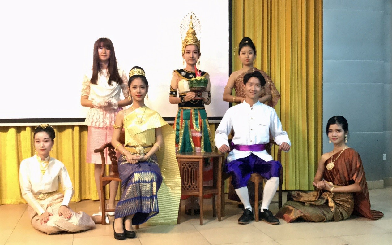 首先,Teavakorn khumsat教师通过演唱泰语问候歌、现场展示合十礼以及泰国四个重要朝代的传统服饰,对泰国礼仪和服饰文化作了精彩的介绍。泰语系大四同学现场进行了泰国礼仪示范,让观众感受到微笑国度的魅力;大二同学表演了一场“泰国四朝代服饰秀”,让观众们在享受视觉盛宴的同时更好地了解泰国历史。