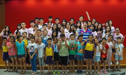 紧接着是队伍介绍环节,义教组和后勤组上台介绍,并一同为小朋友们带来一首《宠爱》,表达我们会在接下来的时间里给予学生们无限的宠爱。演唱结束后,为了让小朋友们充分参与到开幕式中,活动穿插了一个名为“抱团大作战”的游戏,使得现场气氛活跃起来;接着,调研组和文宣组上台介绍并演唱一首《青春修炼手册》,领唱黄翊武带动现场气氛,鼓励小朋友们一同加入,S.D.S服务队队员们与小朋友们相处融洽;随后,一个名为“九九乘法表”的游戏开启了队员们与小朋友们之间的头脑风暴。对游戏的的获胜者我们都给予了小奖品作为鼓励。最后,S.D.S服务队全体队员们为大家演唱队歌《映夏的少年》,在队员们悠扬歌声和小朋友们的笑声中,本次开幕式圆满结束。