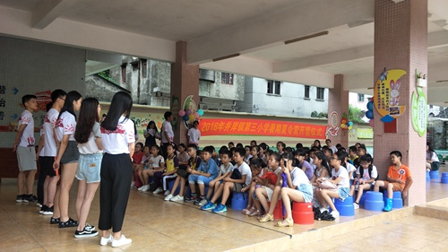 本网讯 7月13日上午9时,2018年井岸镇第三小学暑期夏令营开营仪式在井岸三小阳光大厅举行。井岸镇第三小学德育处主任吴志荣出席并发表讲话,广东外语外贸大学会计学院Sparkle三下乡服务队全体队员和井岸三小53名学生参加了本次开营仪式。