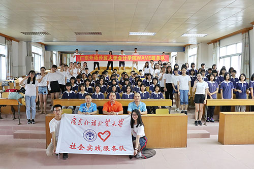 接下来,WAVE服务队的副队长冯德鸿作为代表发言,他首先介绍了广东外语外贸大学的发展现状,并强调广东外语外贸大学是一所具有鲜明国际化特色的广东省属重点大学。其次他向同学们介绍了WAVE服务队的基本情况,队伍包含义教组、文宣组、调研组、后勤组共四组,能从不同方面保证本次三下乡活动的顺利进行。最后他坚定了队员们为灌溉每一个梦想,尽自身绵薄之力的信念,并期望在接下来的日子里WAVE服务队能给同学们带去知识和欢乐。