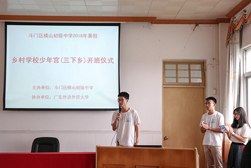 本网讯 2018年7月13日早上,斗门区横山初级中学2018年暑假乡村夏令营(三下乡)开班仪式正式举行,本次活动的主办单位为斗门区横山初级中学,协办单位为广东外语外贸大学。横山中学副校长曾强辉、办公室副主任黄坤铭、德育副主任黄沃源代表校领导出席了本次活动,参加本次活动的还有广东外语外贸大学会计学院WAVE服务队和来自横山中学的68名优秀初中学子。