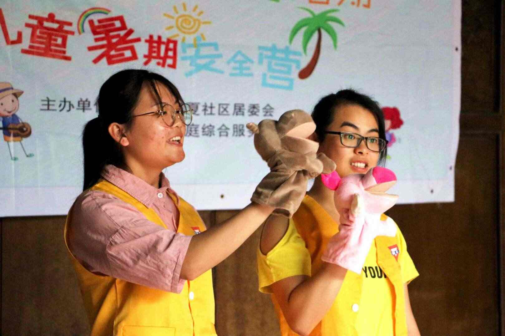 队员张晓婷(左)和张泳琳(右)在利用手偶普及安全知识