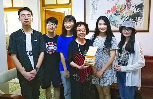 走出文化馆,参观就此告一段落。匆匆脚步,我们去到姚璇秋老师的住所进行了拜访。高龄83岁的姚璇秋老师精神矍铄,热情地接待了调研小组。送上广外出品的印有戏剧脸谱的纪念品后,我们与姚璇秋老师留下了珍贵的合影。在和乐融融的气氛下,我们以轻松聊天的方式开展了采访工作。姚璇秋老师先是向我们讲述了解放前潮剧演员们艰苦生存卖艺的故事,以及解放后潮剧剧团条件及环境的巨大改善,以此引出她走上潮剧这条道路的起因和过程。聊及巧遇潮剧伯乐的片段时,姚璇秋老师颇有兴致地唱起了她当年初涉戏剧时所学的汉剧,并向我们展示了不同于汉剧假声发音的潮剧高亢唱法。随后姚璇秋老师分享了她进入剧团后与代表作《扫窗会》相遇的故事,以及在广州汇演时与著名京剧演员梅兰芳先生短暂而难忘的交流过程。最后姚璇秋老师就传承潮剧文化问题简单讲述了当年培养新生代的经过。收获颇丰的采访工作结束后,调研小组非常荣幸能够与姚璇秋老师在老字号潮汕小食店共进午餐,一起度过了感受潮汕文化的愉悦时光。