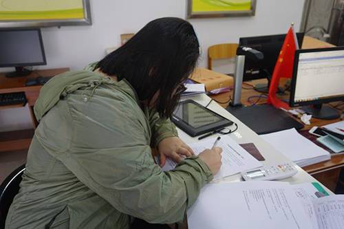 在队员与主任进行交谈的过程中,有同学来到学生资助中心了解助学贷款的相关信息并办理续贷手续,在办事人员办理手续的过程中,队员与该同学介绍相关的助学贷款政策并邀请其填写调研问卷。