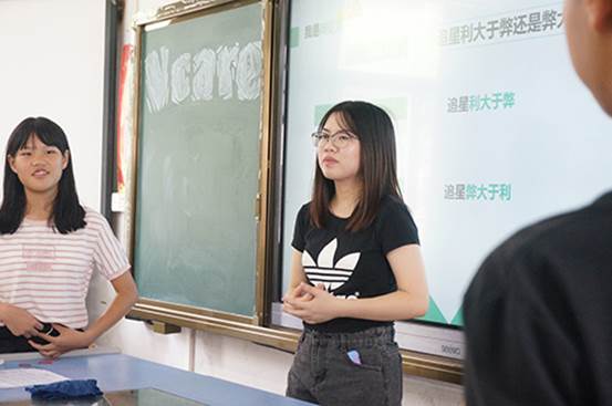 第二节课是由麦婉婷老师讲授的辩论课。老师首先为学生正式介绍了辩论的定义与内涵,并举例来帮助学生们进行理解。紧接着老师为学生介绍了“以点带面,全线突破”、“分清语境,紧握主旨”和“以其人之道还治其人之身”辩论方法,帮助学生们提升自己的辩论技巧。接下来老师为学生播放了《奇葩说》的视频片段:《朋友圈该不该屏蔽父母》。精彩的辩论视频激发了学生们对辩论的兴趣,学生们跃跃欲试。最后老师以“追星是利大于弊还是弊大于利”为主题,组织学生们进行辩论,学生们积极举手参与,课堂气氛十分热烈。