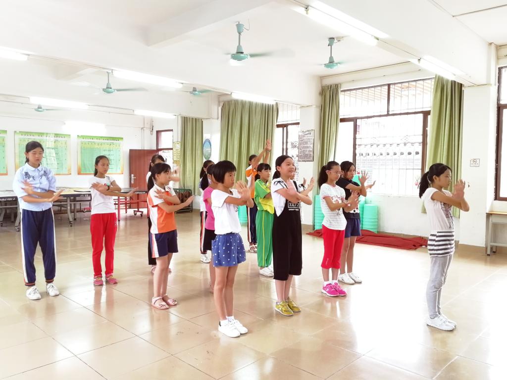 在结束葫芦丝学习后,孩子们来到舞蹈室学习舞蹈。黄意童和曾钰凌老师先是让孩子们复习上节课的舞蹈动作,再进行新的教学。令人欣慰的是,孩子们课后都有复习舞蹈动作,这使得今日复习时其舞蹈动作在正确度、统一度上都进步了许多。在新的舞蹈动作学习中,孩子们难免有些生疏,神态上稍显慌乱。老师们耐心地进行多次的动作示范,通过反复地喊口令、播放音乐的方式,让孩子们熟悉动作。