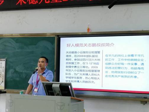 下午,道德讲堂在大课室召开。主持人运用孔子的格言“人而无信,不知其可也”,引入了本次道德讲堂。其后,好人模范、小谷围街出租屋管理员关志鹏给小朋友们上了道德一课。他通过讲述亲身经历的事例告诉小朋友们:要当一个文明人、做好事、做三好学生;同时要提高观察力,注意安全;并做到感恩自己的长辈。随后,来穗之家所举办的朗读者比赛很快开始。小朋友们用稚嫩的童声,向观众们讲述了对祖国、对党的热爱和对家人的爱与感恩。