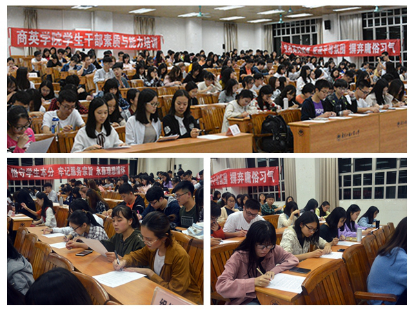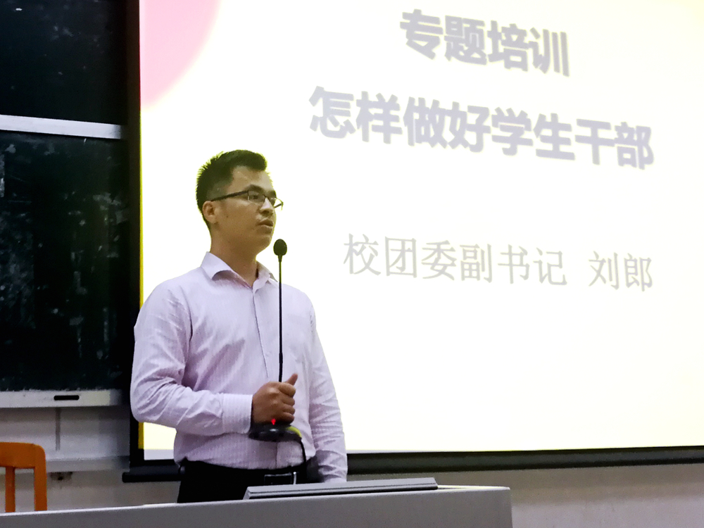 本网讯 10月18号晚8点, 国际商务英语学院(以下简称“商英学院”)学生干部素质与能力培训第一场在第二教学楼217顺利召开,校团委副书记刘郎应邀做《对标‘八有’,做一名肌体健康的学生干部》专题培训。商英学院团学、党建、年级级长、班长等近300名学生干部参加培训。