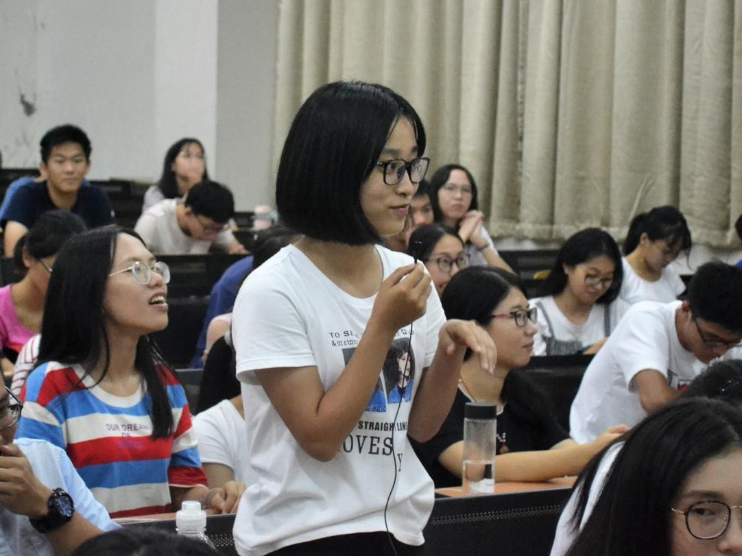 接下来是妙趣横生的观众互动环节。同学们在认真观看完选手辩论之后,纷纷提出了自己的见解,提问的前三位同学都对正方的选手进行提问,而他们都强调了金钱与幸福感之间的联系是否必然这个观点。后面几位同学则对反方的选手进行提问,也提出了具有共通性的问题。