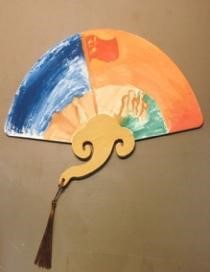 “毛泽东画像”主题画扇及书法临摹:左边扇子上是毛泽东同志农民运动时的画像,右边是对叶挺同志在北伐战争时的书法临摹。