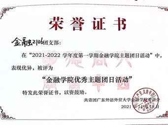 一年来,金融2106班团支部曾获评广东外语外贸大学2021-2022学年度“红旗团支部”称号,曾获广东外语外贸大学金融学院第八届田径运动会团体总分第二名,所组织团日活动曾多次获评“金融学院优秀主题团日活动”称号。