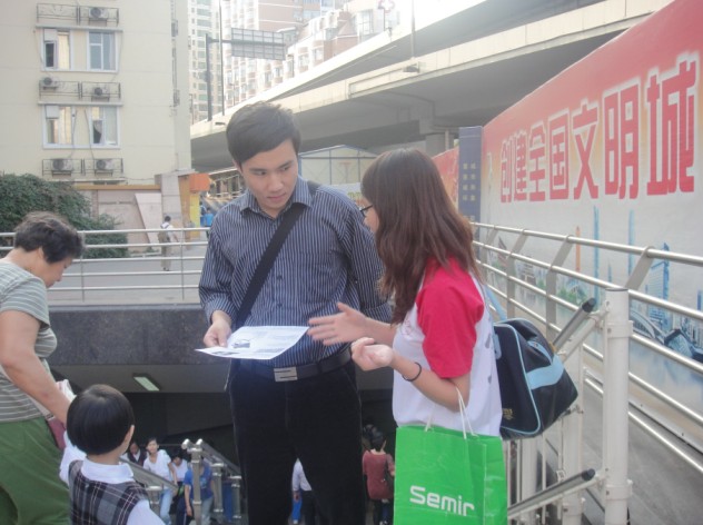 参观完中共三大遗址,同学们来到了人来人往的东山口地铁站,向路人派发有关党史知识的传单,以此宣传中国共产党成立90周年的重大意义。传单的主要内容是同学们精心搜集的具有代表性意义的党史知识以及革命先烈的英雄事迹,吸引了不少行人驻足聆听。